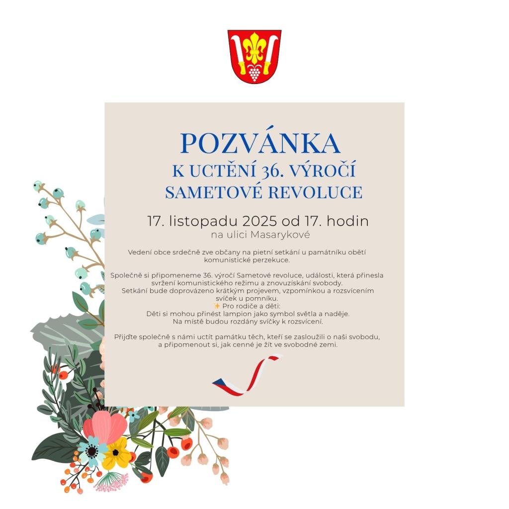 Vedení obce zve občany na pietní setkání u památníku obětí komunistické perzekuce, které se uskuteční 17. listopadu 2025 od 17 hodin na ulici Masarykové. Při této příležitosti si připomeneme 36. výročí Sametové revoluce, jež přinesla svržení komunistického režimu a znovuzískání svobody. Setkání zahrnuje krátký projev, vzpomínku a rozsvícení svíček u pomníku. Děti si mohou přinést lampion jako symbol světla a naděje a na místě budou rozdány svíčky k rozsvícení.