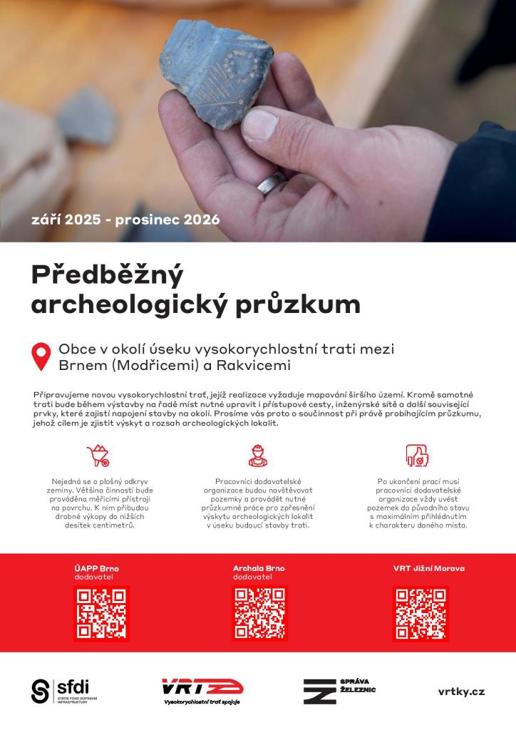 Připravujeme novou vysokorychlostní trať, jejíž realizace vyžaduje mapování širšího území. Kromě samotné trati bude během výstavby na řadě míst nutné upravit i přístupové cesty, inženýrské sítě a další související prvky, které zajistí napojení stavby na okolí. Prosíme vás proto o součinnost při právě probíhajícím průzkumu, jehož cílem je zjistit výskyt a rozsah archeologických lokalit.
