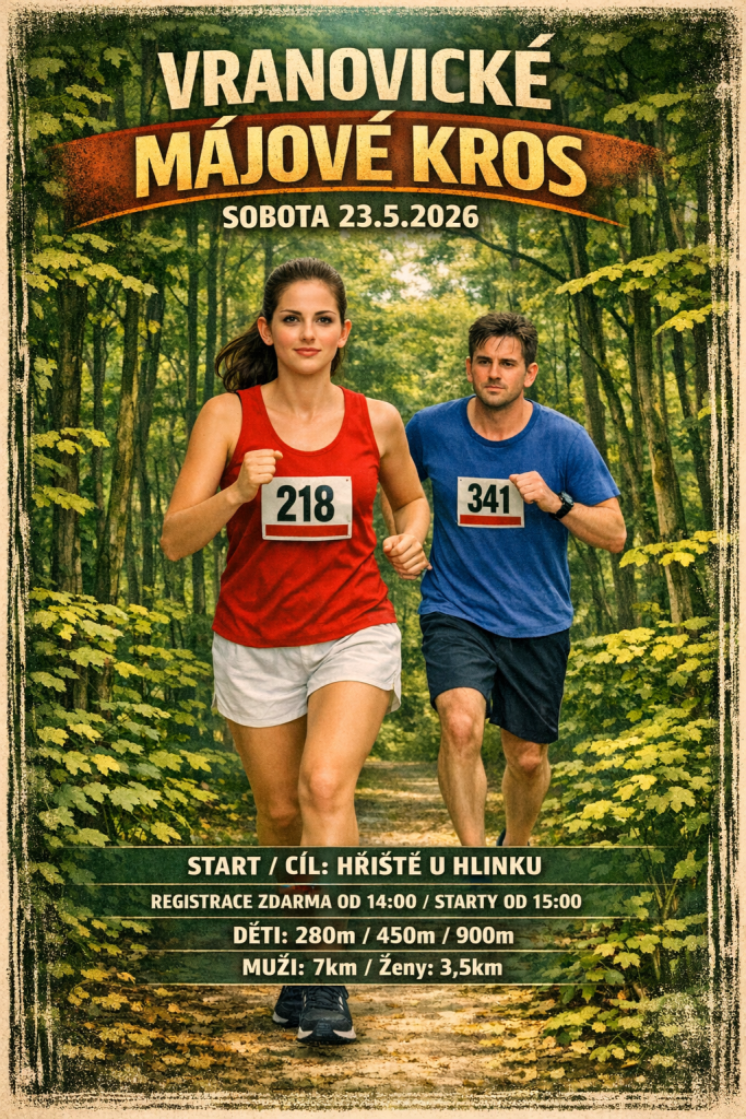 Sportovní komise obce Vranovice srdečně zve všechny běžce na již tradiční Vranovické májové kros, které se uskuteční v sobotu 23.5.2026. Startovné je zdarma. Registrace bude probíhat od 14:00 v parku Hlinek. Starty běhů začnou v 15:00, od nejmladší kategorie. Pro děti jsou připraveny tratě v délce 280m, 450m a 900m v parku Hlinek. Dospělí poběží vranovickým Hájkem - ženy a mladí (15+) jeden okruh (3.5km), muži (18+) dva okruhy (7km). Pro nejrychlejší v jednotlivých kategoriích jsou připraveny upomínkové medaile. Přijďte si zasportovat, těšíme se na vás!