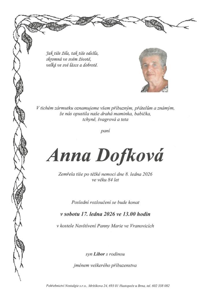 Poslední rozloučení se bude konat v sobotu 17. ledna 2026 ve 13.00 hodin v kostele Navštívení Panny Marie ve Vranovicích.