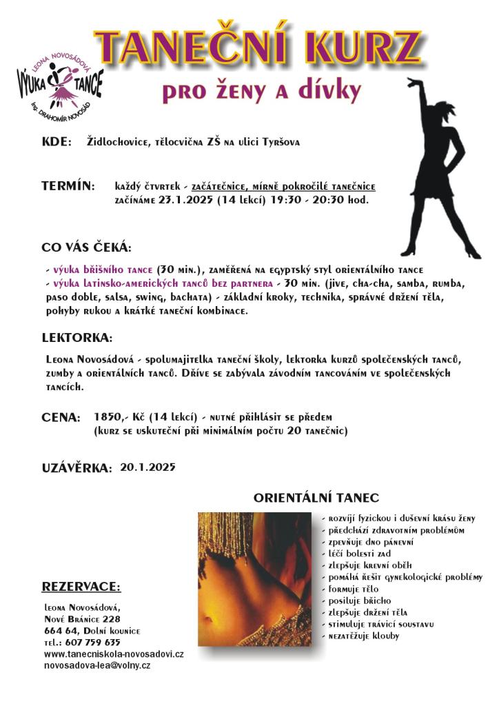 Taneční škola Novosádová pořádá kurz břišního a latinsko-amerického tance pro ženy v tělocvičně ZŠ na ulici Typšova v Židlochovicích. Kurz začíná 23. ledna 2025 a potrvá 14 týdnů. Účastnice budou mít možnost naučit se základní kroky, techniku a správné držení těla v egyptském stylu orientálního tance, jive, cha-cha, samba, rumba, paso doble, salsa, swing a bachata. Lektorkou je Leona Novosádová, spolumajitelka taneční školy a zkušená tanečnice. Cena kurzu je 1850 Kč a přihlásit se je nutné do 20. ledna 2025. Kurz se uskuteční při minimálním počtu 20 tanečnic.