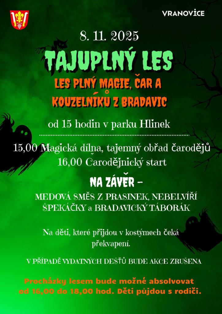 Zveme vás na akci Tajuplný les, která se uskuteční 8. listopadu 2025 od 15 hodin v parku Hlinek ve Vranovicích. Čeká na vás magická dílna, tajemný obřad čarodějů a procházka čarovných lesem. Na závěr si pochutnáte na medové směsi z Prasinek, špekáčkách a užijete si bradavický táborák. Děti, které přijdou v kostýmech, obdrží překvapení. V případě vytrvalých dešťů bude akce zrušena.