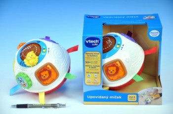 Vtech upovídaný míček na baterie má zabudováno pohyblivé čidlo, takže je neustále v pohybu. Míček hraje různé známé melodie, písničky a pokládá dítěti spoustu otázek. Na sobě má 3 pohyblivá zvířátka, otáčejícího a blikajícího ptáčka, 3 mačkací tlačítka. Tato hračka rozvíjí hrubou dětskou motoriku.