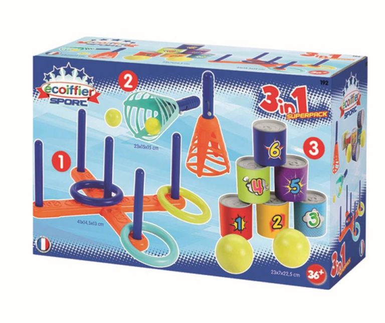 Tři hry určené jak do interiéru i exteriéru. Holčičky a kluci si mohou zkoušet házet barevné kroužky na stojánky, chytat míček do košíčku nebo zkoušet shazovat plechovky.